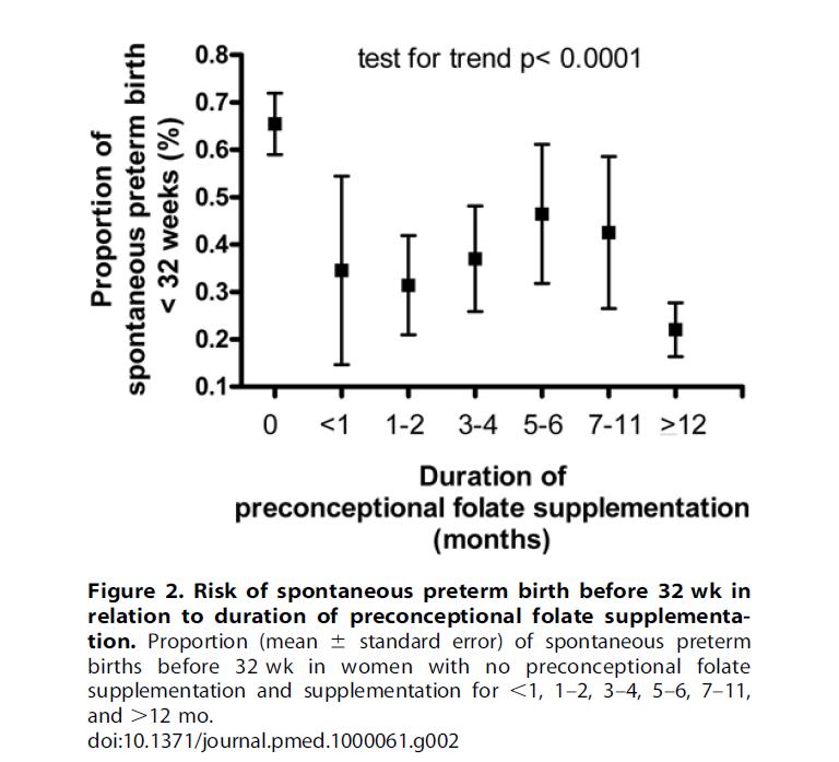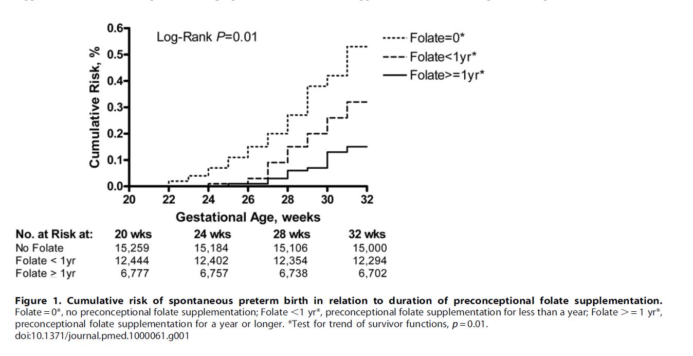 Nie było prawie żadnej różnicy pomiędzy trzy grupy. Oznacza to, że kwas foliowy zapobiega jedynie „bardzo wczesnym przedwczesnym porodom”. porodu” i nie ma wpływu na poród przedwczesny w okresie zbliżającym się do terminu porodu.