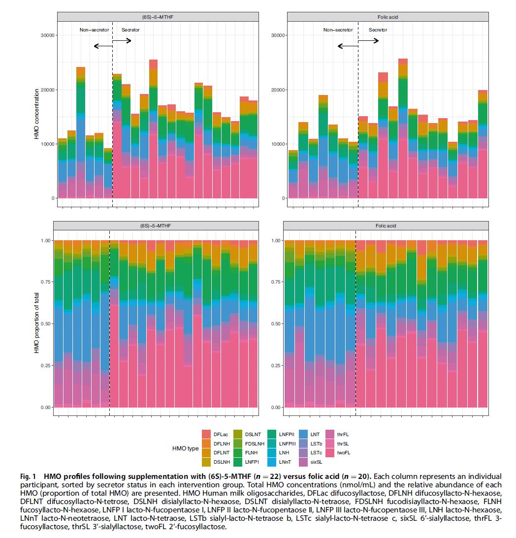 Z tego badania wynika nieoczekiwany wniosek: chociaż całkowite poziomy HMO nie różniły się istotnie pomiędzy obiema grupami, zawartość niezmetabolizowanego kwasu foliowego (UMFA) w mleku matki grupy kwasu foliowego osiągnęła aż 29%, ponad dziesięciokrotnie więcej niż w przypadku 5-MTHF grupa. Co więcej, analiza danych wykazała, że były wyższe poziomy UMFA związane z niższymi całkowitymi stężeniami HMO i znacznie zmniejszone 3′SL.