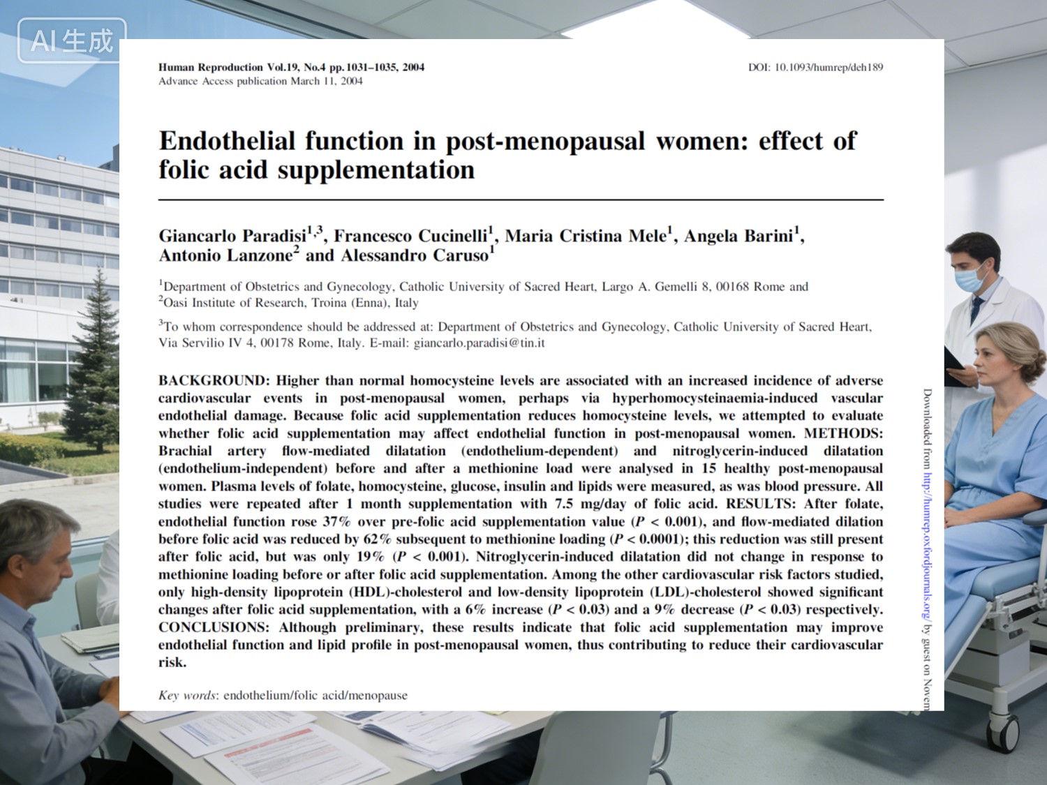 A przełomowe badanie z 2004 r. opublikowane w Rozmnażanie człowieka (JEŻELI 6.1) przez Giancarlo Paradisi, Francesco Cucinelli i współpracownicy skupili się szczególnie na kobiety po menopauzie. Piętnastu zdrowych uczestników, reprezentatywnych dla typowych stan pomenopauzalny, wziął 7,5 mg/dzień kwas foliowy przez miesiąc. Wyniki wykazały wyraźną poprawę: